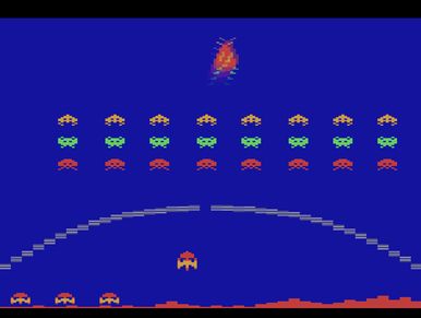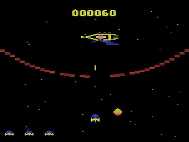 The Gorfian Flag Ship is protected by a ionized shield and hurls deadly fireballs. Chip away at the hull and destroy the core with a precise shot!